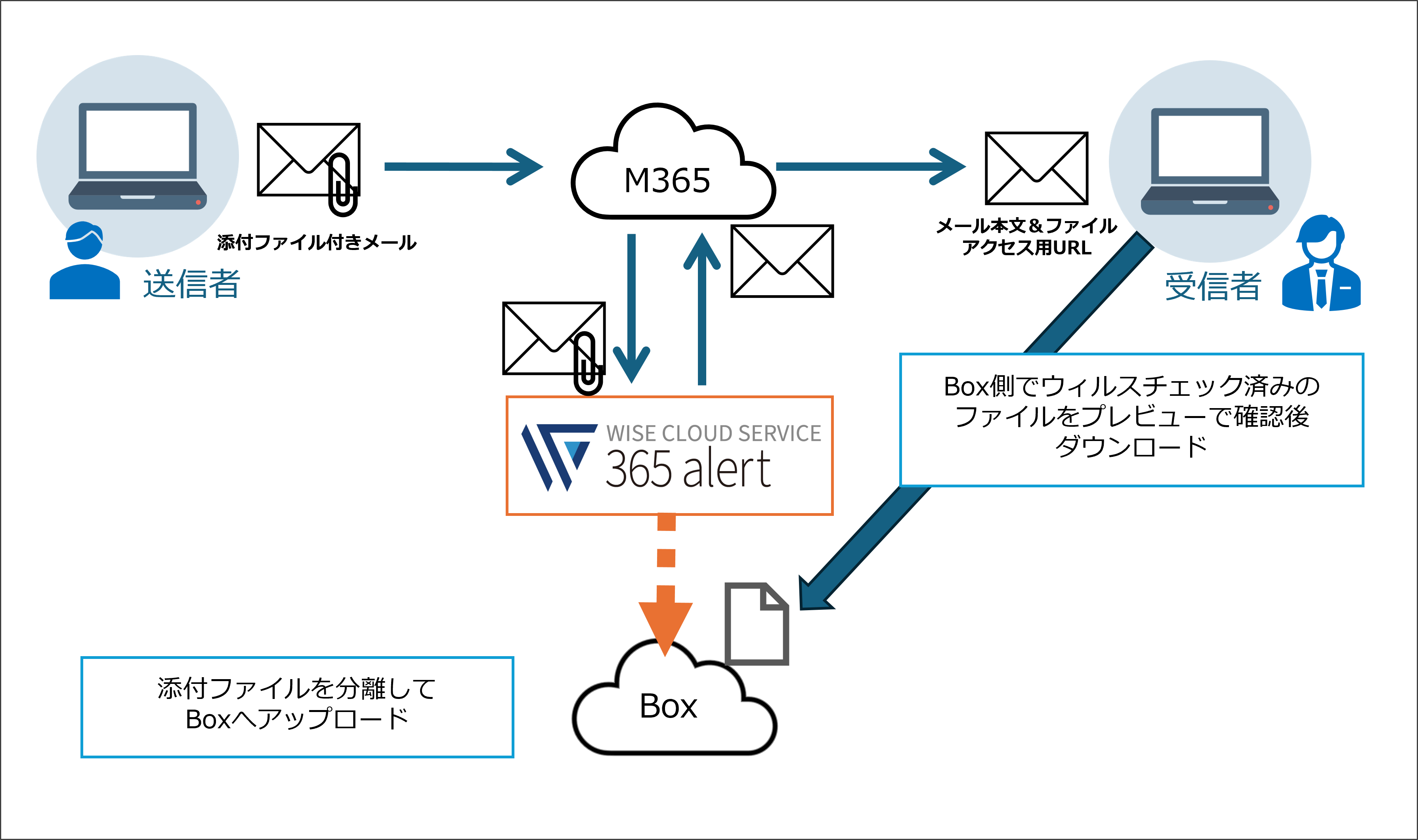 エアーは創業以来、多くの企業の情報セキュリティを支えてきました。私たちは、メールという日常的な業務の中に潜むリスクをゼロに近づけることで、すべての働く人々が安心して業務に集中できる環境を提供したいと常に考えています。こうした想いから生まれた「365 Alert」の新機能「受信連携オプション」は、メールの添付ファイルによるマルウェア感染リスクをゼロに近づけるための新たな挑戦です。本機能では、添付ファイル付きメールを受信した際に、ファイルを自動的に切り離しクラウドストレージ「Box」に格納。そのリンクをファイル(html・PDF)添付、またはメール本文に追記して受信者に通知します。メールの受信者は共有リンクから安全にファイルへアクセスすることが可能です。