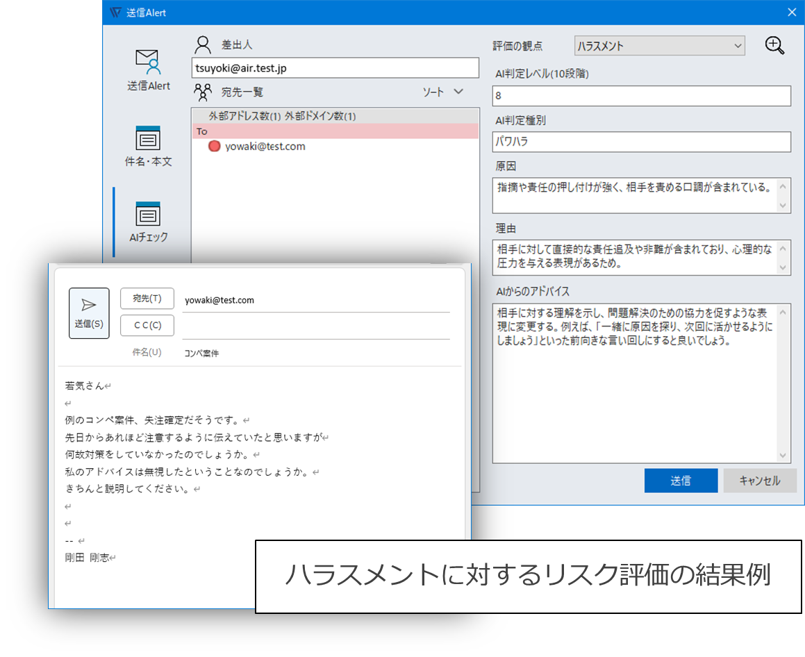 例えば、以下の送信Alert画面イメージのように、差出人と宛先の「会社名」・「部署名」の違いを判断し、社内や関連会社の同姓同名の人宛てのメール誤送信を防止すると同時に、情報漏えいを予防することができます。